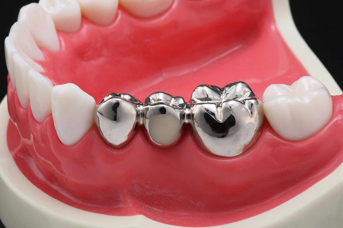 注意点:ブリッジ作製のため、周囲の歯を数本削らなければならないこと、失った歯が担うべき咬合圧を完全に支台歯に支えてもらうため、残存歯への負担が最も大きい治療法です。また、お掃除が難しく、むし歯や歯周病のリスクも少し高まります。失った歯の本数及び部位によっては保険適応外であり、また、作製不可能です。